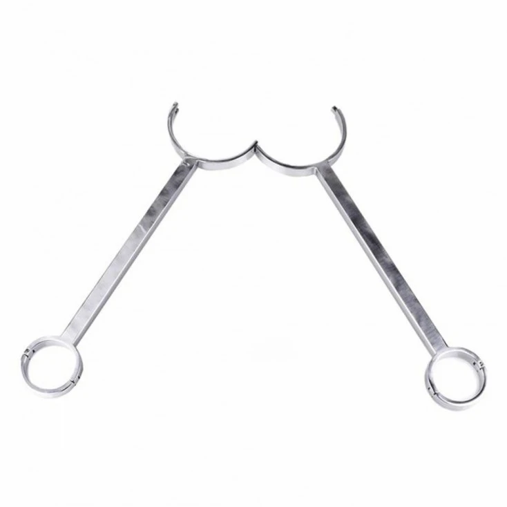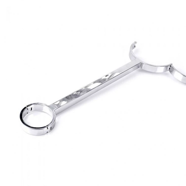 Nous vous proposons une barre d’entrave en acier inoxydable afin de maintenir votre soumis(e) captif(ve) par le cou et les poignets.