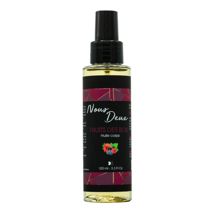 L’huile de massage parfumé est une création de la marque de cosmétiques française Nous Deux, spécialement confectionnée avec la douce odeur sucrée et envoûtante des fruits des bois.